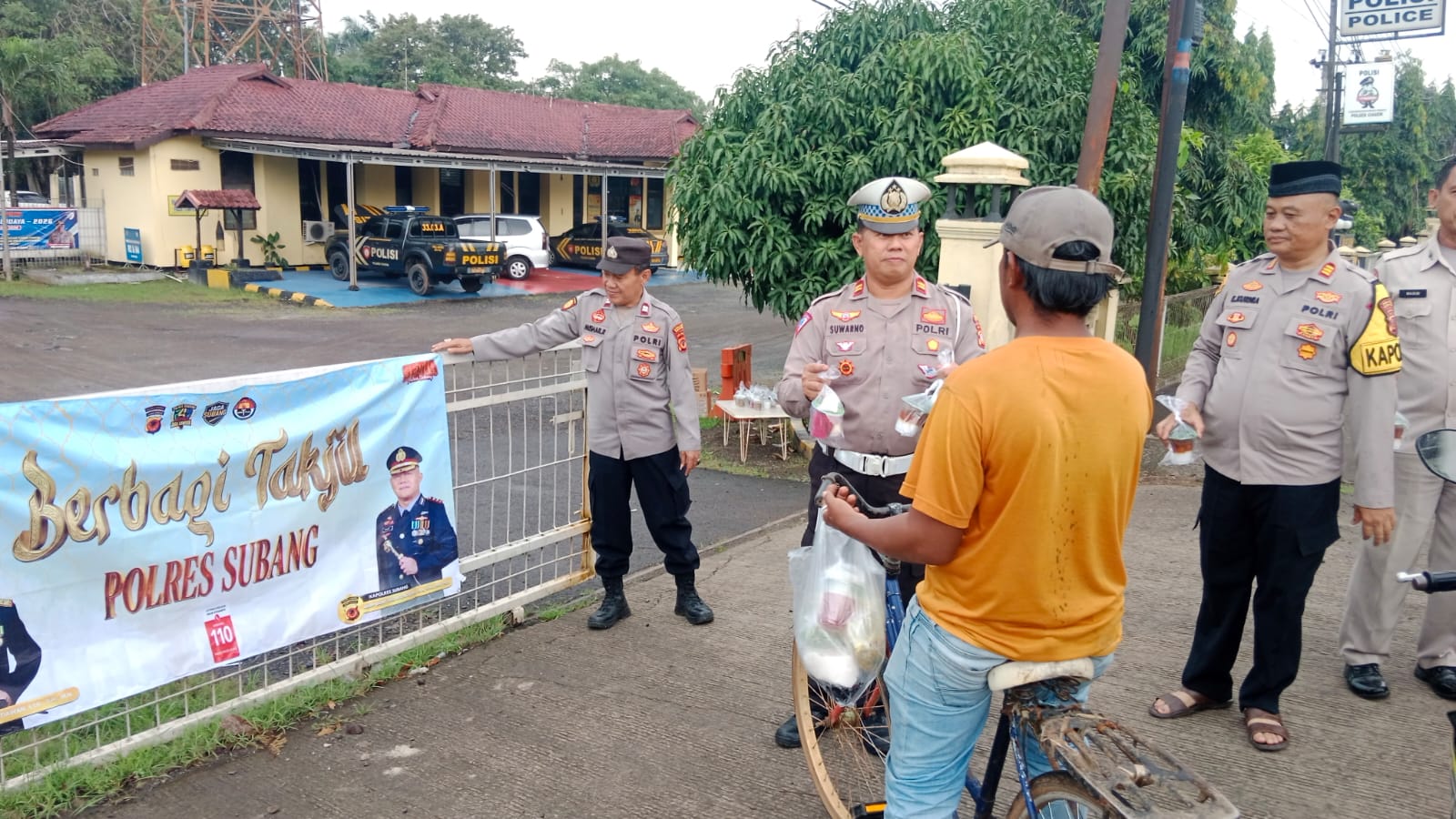 SUBANG (MSS). Tebar kebaikan selama bulan Ramadhan yang penuh barokah ini, Senin sore (2/3) mulai pukul 17.00 di depan Mapolsek Ciasem Kapolsek Ciasem AKP Endang Kurnia beserta personilnya atas arahan dan petunjuk dari Kapolres Subang AKBP Dony Eko Wicaksono membagikan 100 takjil kepada pengendara motor maupun mobil dan warga sekitar.